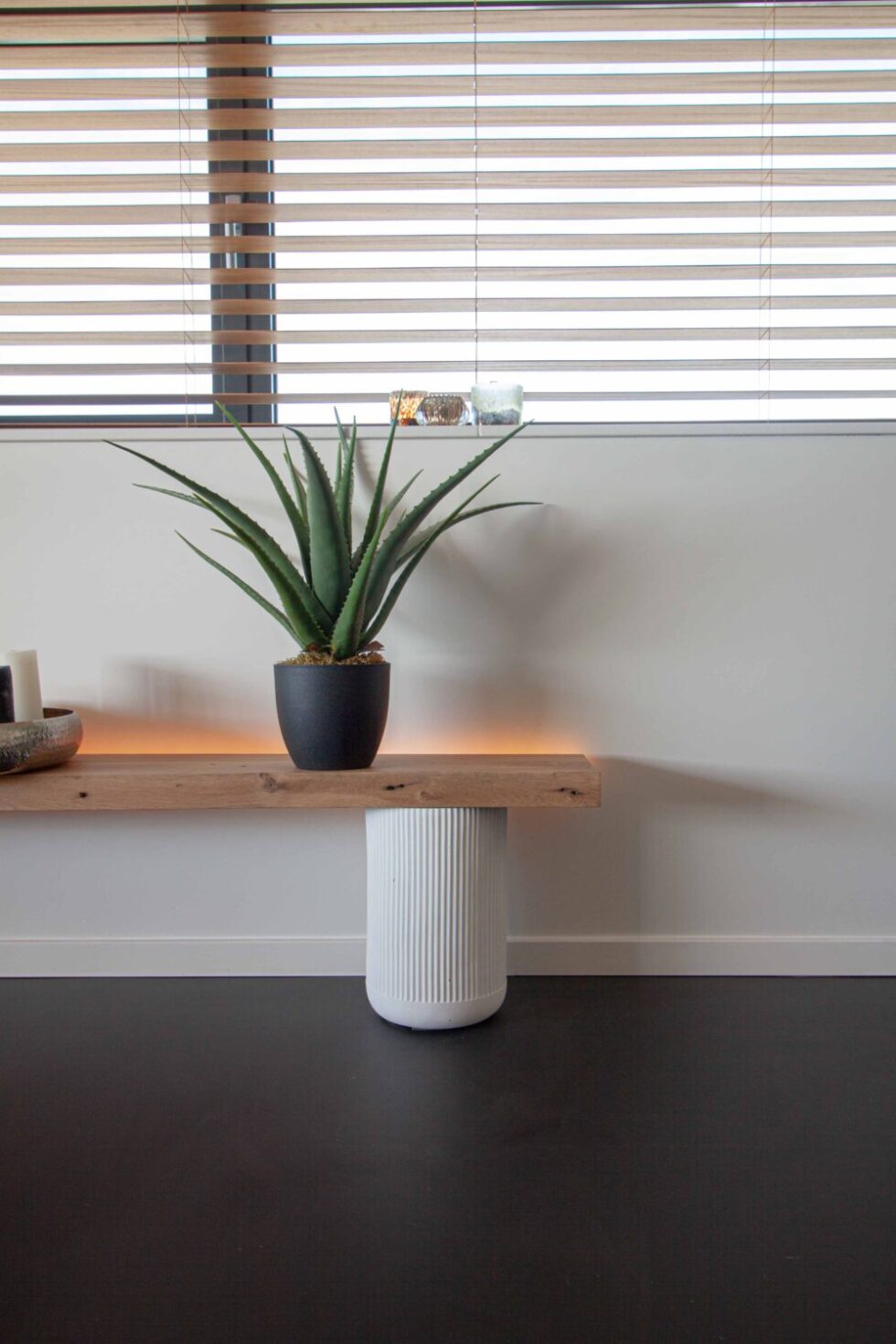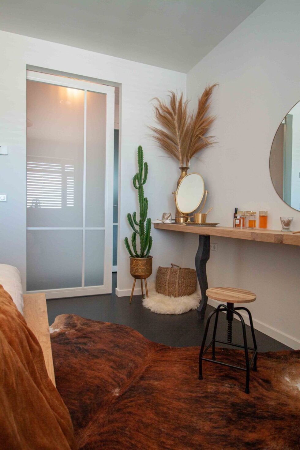 "In unserer Wohnung spiegeln sich viele Strand- und Sandfarben in den Möbeln, der Dekoration und den Wandverkleidungen wider. Im Gegensatz zu vielen Inneneinrichtungen im "Ibiza-Stil" haben wir uns für einige dunklere holländische Naturtöne entschieden, die wiederum gut zu der dunklen Farbe des Fußbodens passen. Der dunkle Gussboden ist ein echter Blickfang und sorgt für viele positive Kommentare.