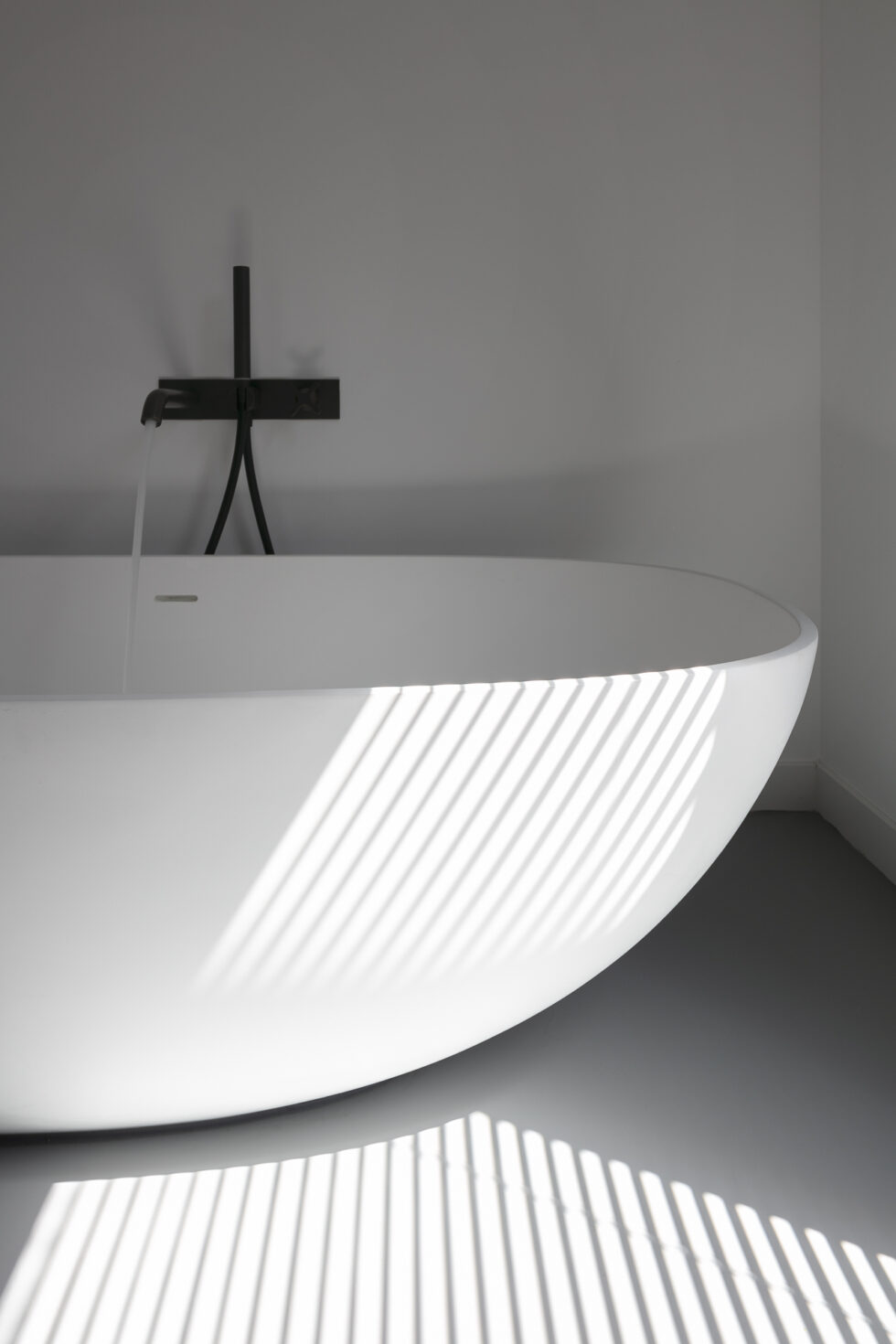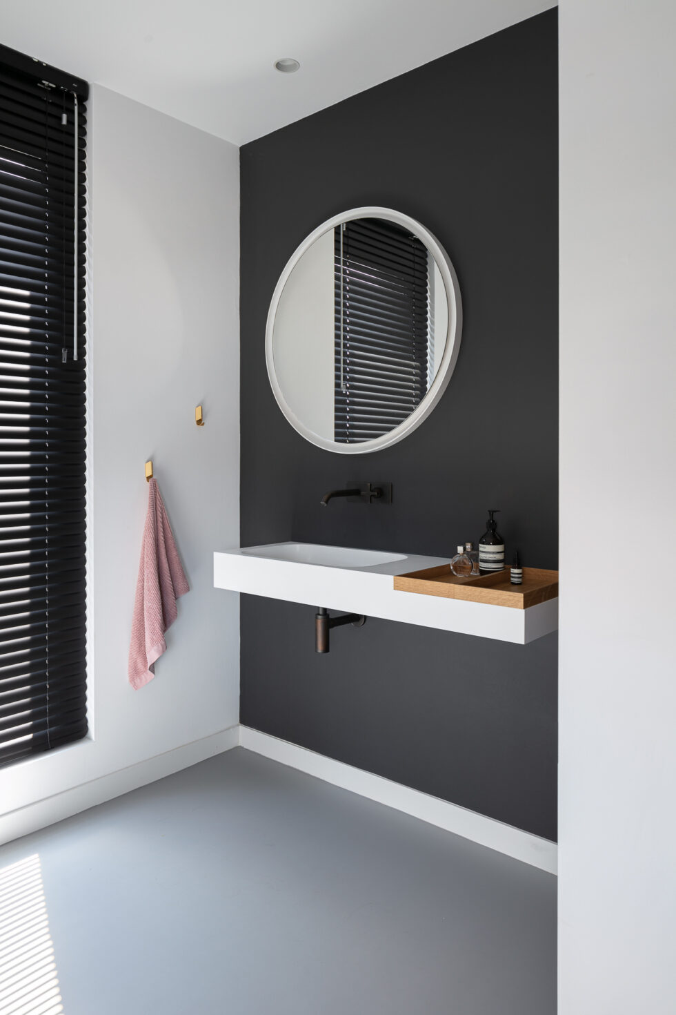 The upstairs does have a uni color. “We hesitated about whether to have the floor applied in the shower as well,” Stijn says. “It could have been done, because a cast floor doesn’t have to be slippery, but from a design perspective we opted to put a different floor in the shower. That exception makes for a very nice aesthetic combination and shows off the sleek cast floor nicely.”