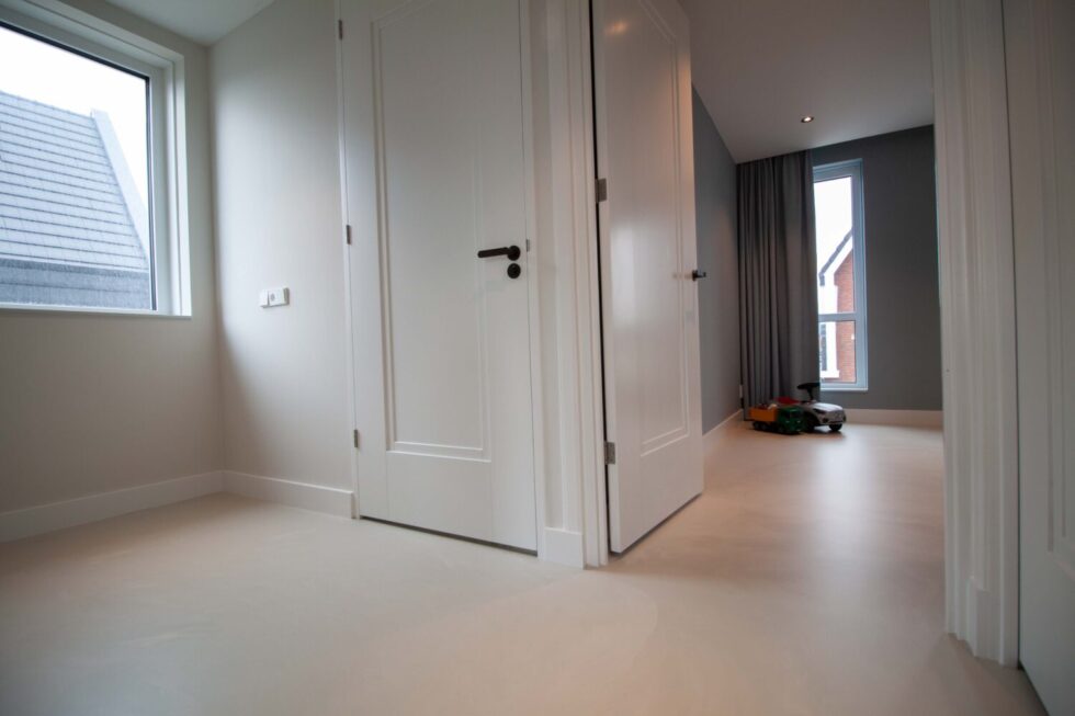 Op de eerste verdieping ligt de Superbase vloer in de kleur Goldy. Deze gietvloer heeft een strakke en moderne afwerking. De vloer is sterk, naadloos en tijdloos. De Superbase vloer voelt zachter aan dan de Corestone Nature en dat geeft een fijn gevoel in de slaapkamer. Door het gladde oppervalk hecht vuil  zich moeilijk. Zo is de vloer makkelijk schoon te maken en houden, ideaal als je een gezin hebt met kleine kinderen.