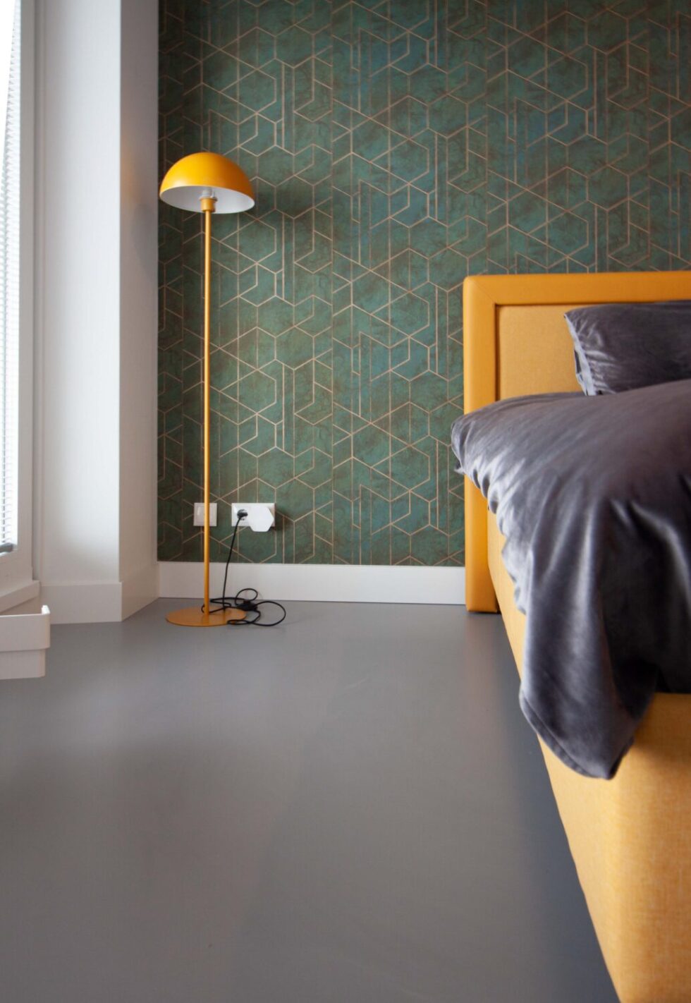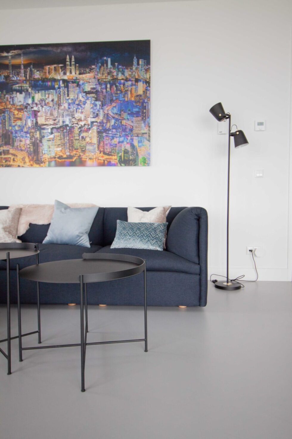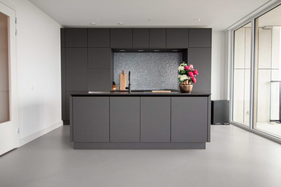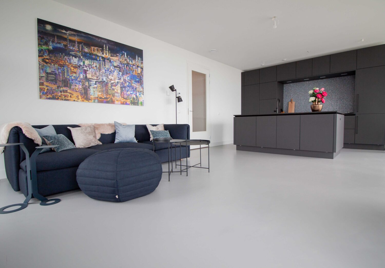 Het appartement oogt ruimtelijk door de grote raampartij die van de vloer tot aan het plafond reikt. De gekozen EPI PU-gietvloer versterkt dit optische gevoel door de grijs blauwige kleur en het naadloze karakter van de vloeroplossing.