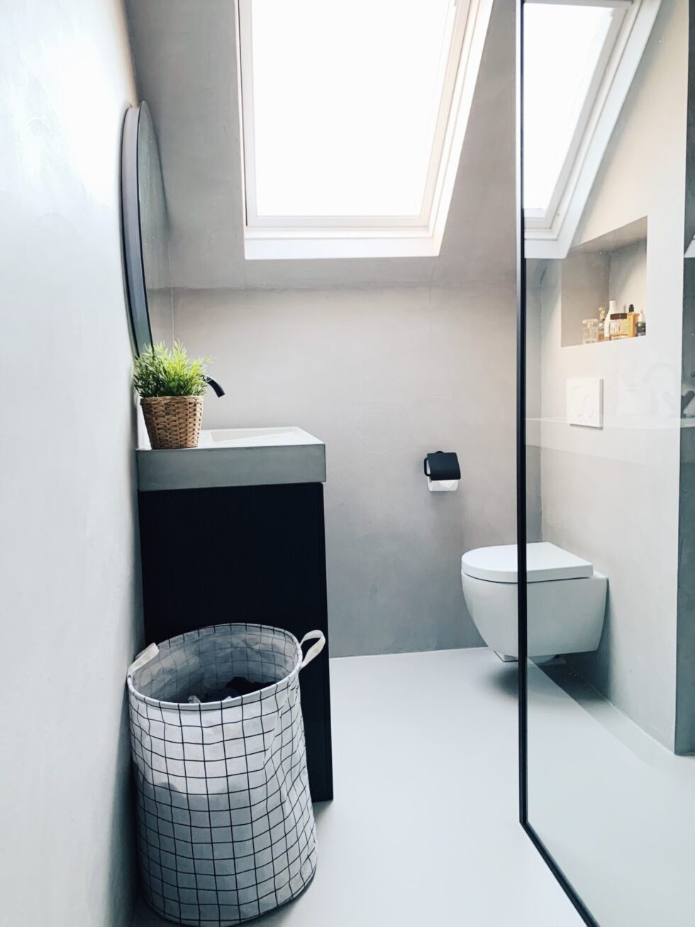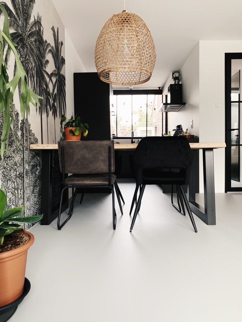 “We wisten vrij snel dat we voor een PU (polyurethaan) gietvloer wilden gaan. In vergelijking met andere soorten vloeren is de PU gietvloer wat elastischer en dus minder scheurgevoelig en verkleurt weinig tot niet. Ook is de PU gietvloer geschikt voor vochtige ruimtes dus konden we deze ook in de badkamer nemen”