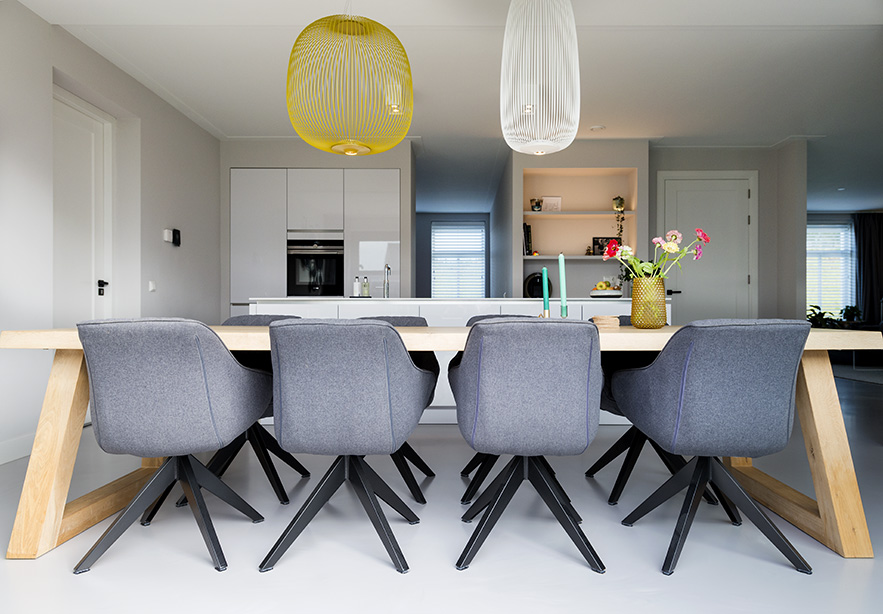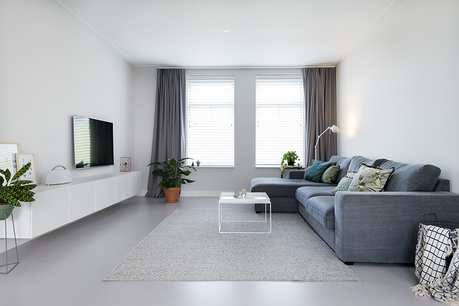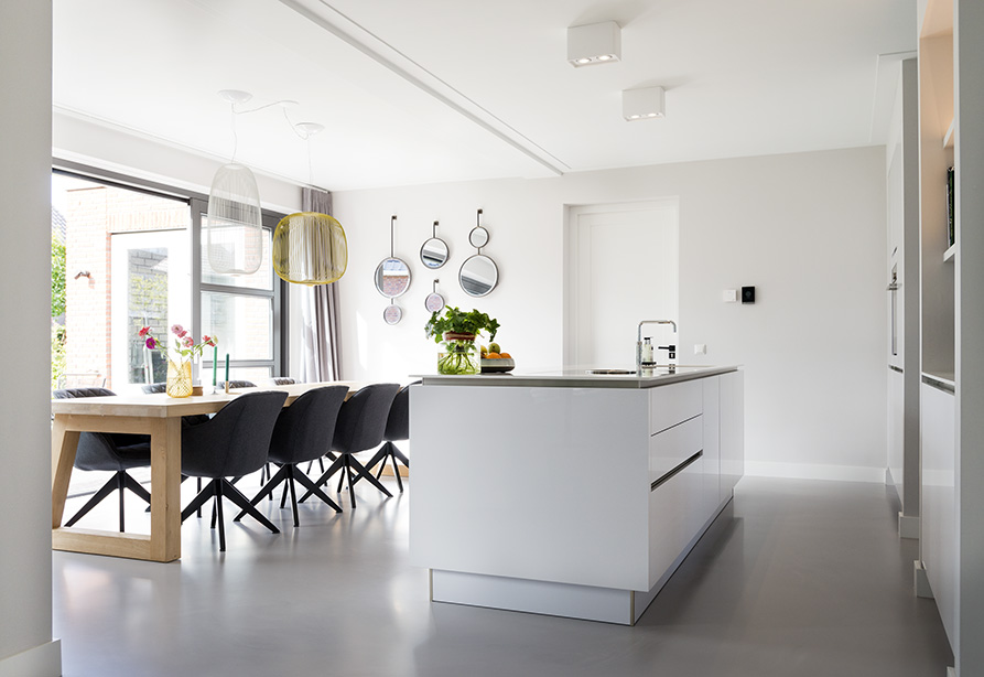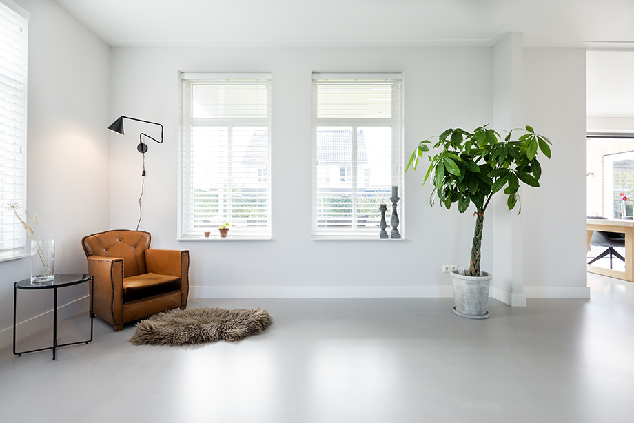 Na uitgebreid alle mogelijke opties te hebben overwogen, koos het stel voor een gietvloer met betonlookuitstraling. Deze vloer laat de leren fauteuil in de leeshoek schitterend tot zijn recht komen, terwijl de betonlook ook prachtig contrasteert met het witte hoogglans keukenblok. Wanneer je de vloer van je dromen hebt gevonden, is het fijn om te weten dat je er de komende jaren optimaal van kunt blijven genieten. De EPI Superbase Gietvloer is 100% alifatisch wat betekent dat de vloer niet verkleurt of vergeelt. “We zijn erg blij met onze prachtige strakke gietvloer met betonlook uitstraling, die gegarandeerd niet verkleurt.”