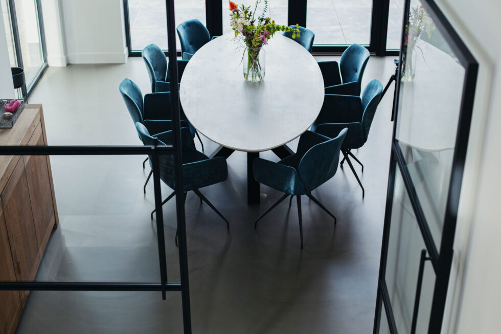 In de badkamer is er voor gekozen om de vloer naadloos door te laten lopen: “In de badkamer hebben we de blend laten afwerken met een stroefheidsfractie. Je ziet er niets van, maar zo’n antislipbehandeling zorgt er wel voor dat je niet uitglijdt.” De combinatie met vloerverwarming zorgt in de badkamer voor extra comfort. “Ook met blote voeten is het heerlijk warm om op te lopen.”
