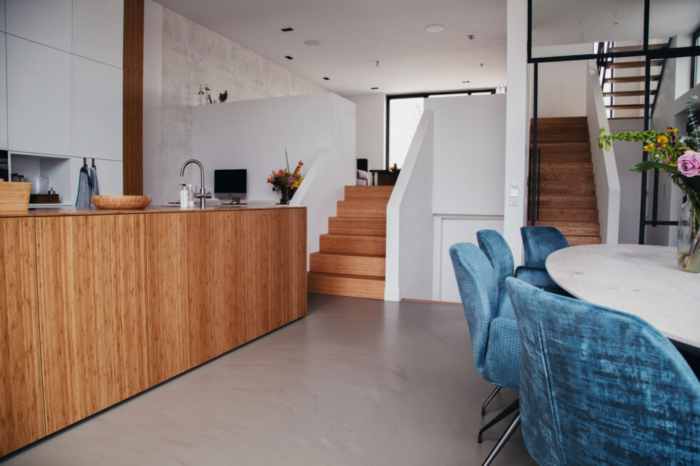 Een strakke gietvloer is een lust voor het oog en geeft elke ruimte in elke woning iets speciaals. Toen de Familie Smits hun kavel bemachtigde op Eiland IV, het meest zuidelijk gelegen eiland in Waterrijk Woerden, wisten ze het al: “We willen een hygiënische, naadloze vloer die warmte uitstraalt; een vloer die goed te combineren is met vloerverwarming en die bovendien geluiddempend werkt.” De EPI Superbase gietvloer voldoet aan al deze criteria en was daarom een logische keuze.